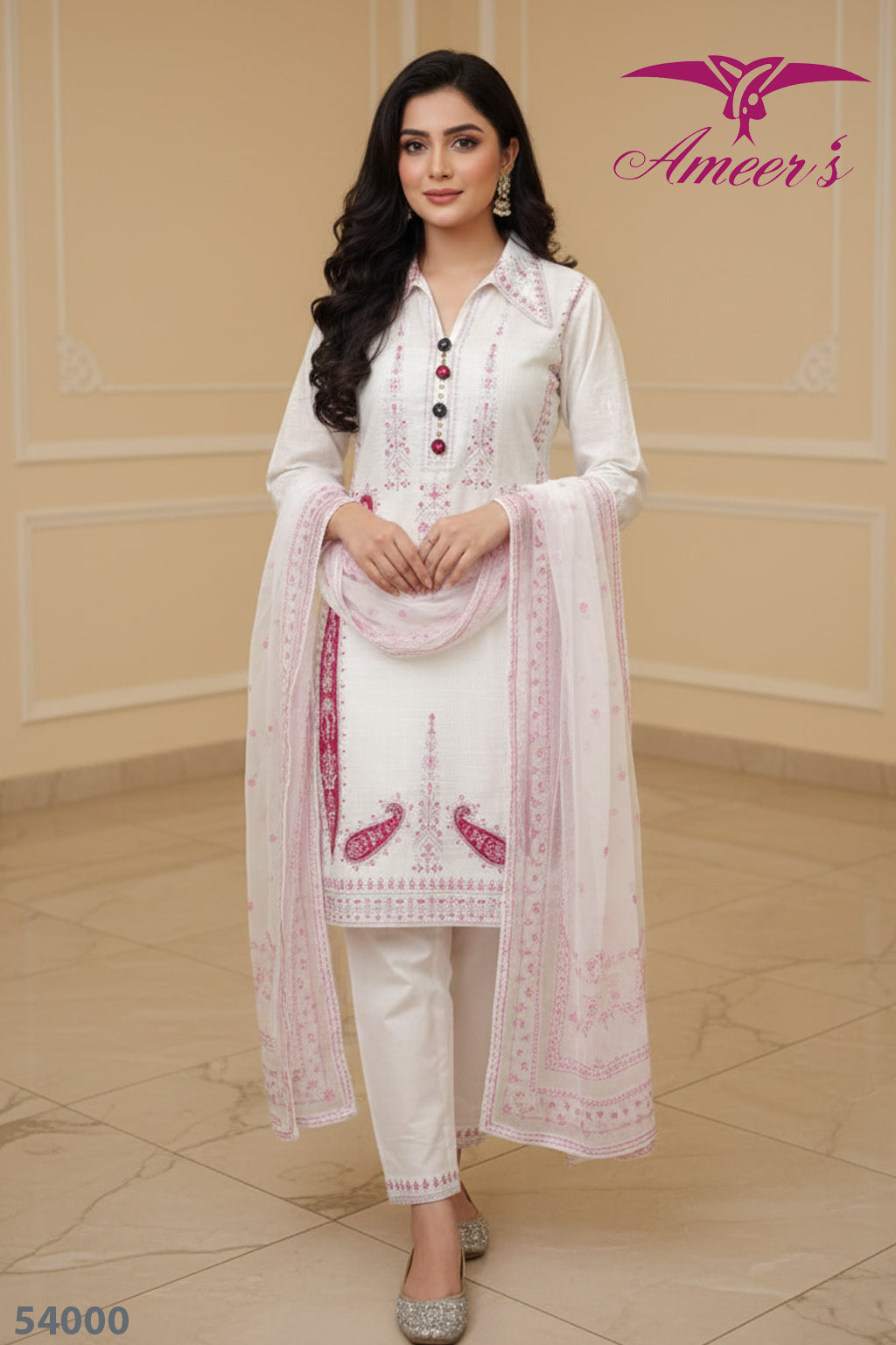 Art # 54000 Ameer Sons Collections Suit detail: Embroided Shirt, Duppta With Capri  Colors: white, Black For more trends Click Here