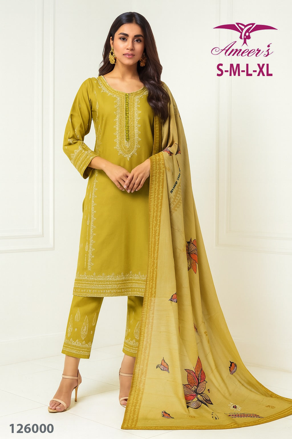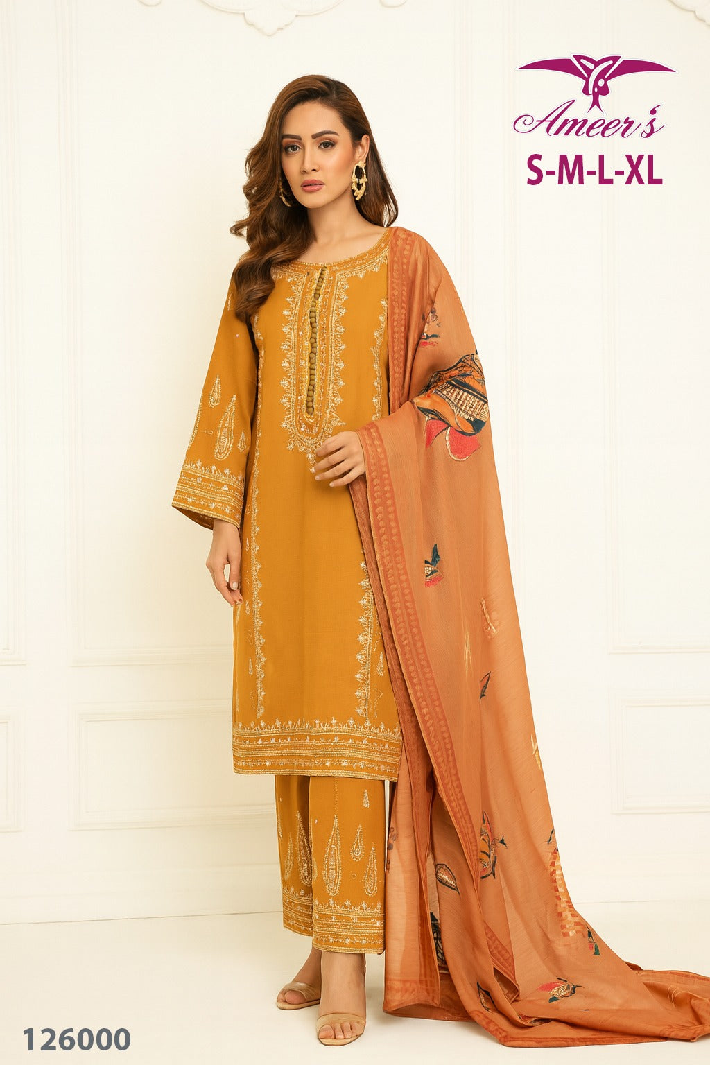 Ameer’s Art #126000 New Launch 🌸Elegant 3PC Embroidered khaddar Suit – now in 2 stunning colors: MEHANDI | MUSTURD..Sizes: S, M, L, XL